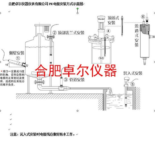 1. PH電極安裝應(yīng)使用電極安裝支架或流通杯。(適用于沉入式安裝或流通式安裝)。請不要把PH電極直接投入水中。